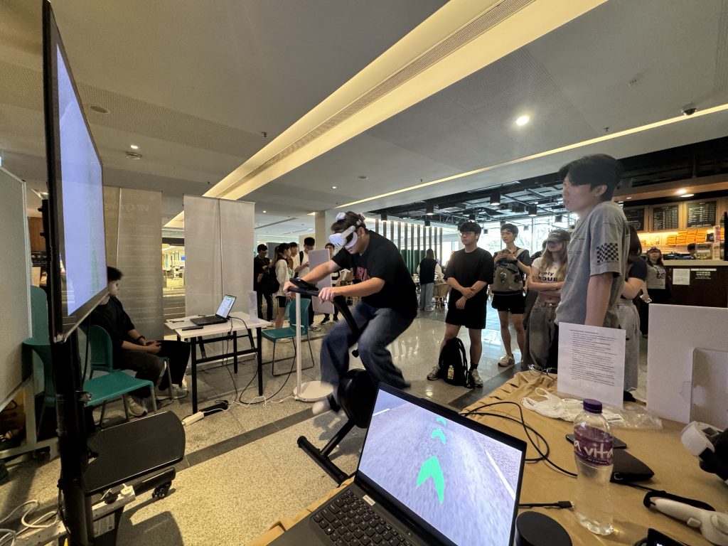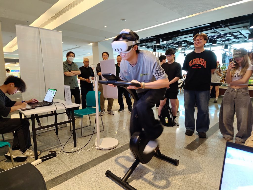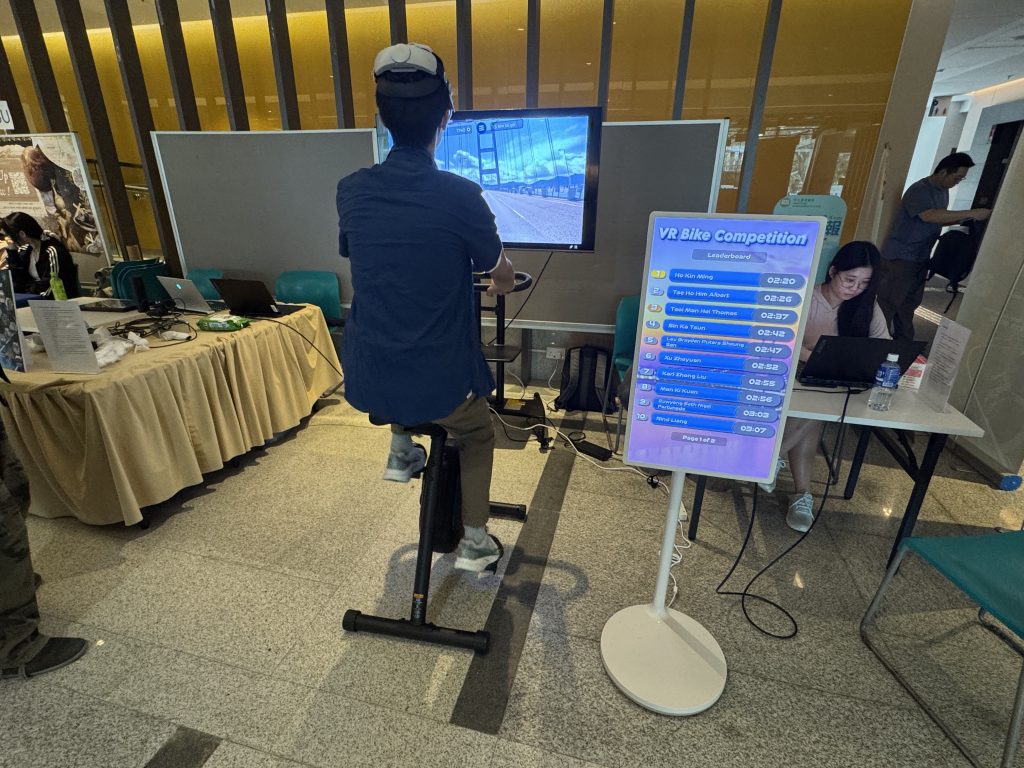 The VR Bike Experience offered an innovative blend of virtual reality technology and physical engagement, allowing participants to take part in both competitive and recreational cycling activities. The event comprised the VR Bike Competition, where staff and students competed together on a designated 1.5 km route to achieve the fastest completion time, as well as the VR Cycling Tour, which provided participants with a more relaxed experience to cycle through a range of scenic virtual routes from around the world.